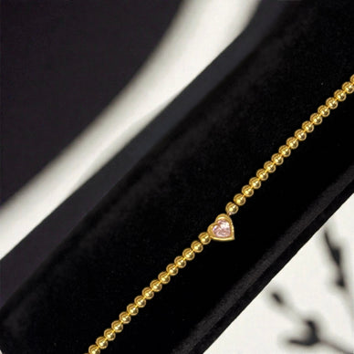 Delicate with a romantic touch, the Blush Heart Beaded Bracelet features polished gold-toned beads centered with a soft pink heart stone. Designed to add effortless charm, this piece blends femininity and luxury, making it perfect for everyday wear or subtle stacking.